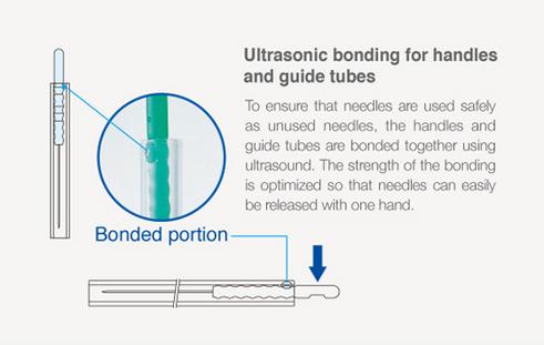 Bogate doświadczenie oraz innowacje technologiczne umożliwiają nam wykonać bezpiecznie połączenie igły z uchwytem dokładnie w jego środkowym punkcie. Technika ta ułatwia nakłuwanie i zmniejsza obrażenia tkanki, gdyż obrót igły pozwala stymulować aktywny punkt na ciele.